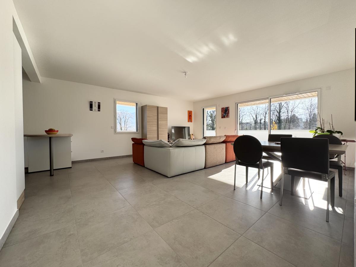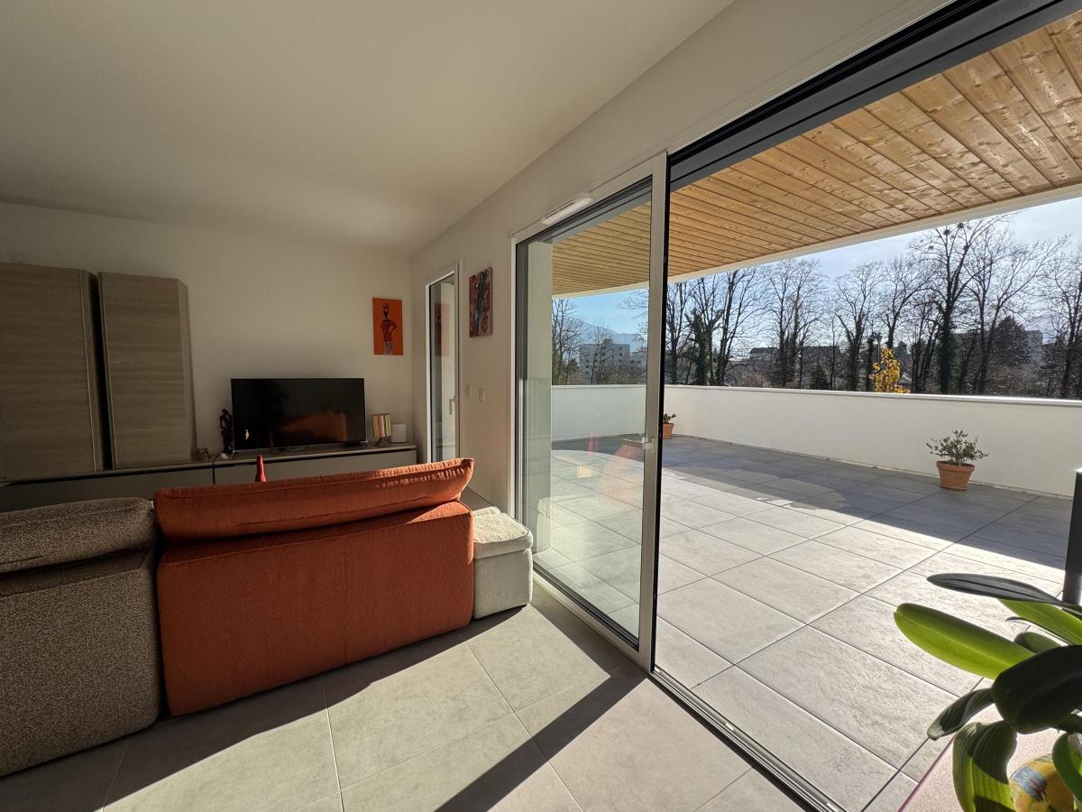 Atout majeur et rare sur le secteur : une terrasse exceptionnelle d’environ 65 m², exposée plein Sud, accessible depuis le séjour et l’une des chambres, véritable prolongement de l’espace de vie, offrant une vue dégagée sur les massifs environnants.